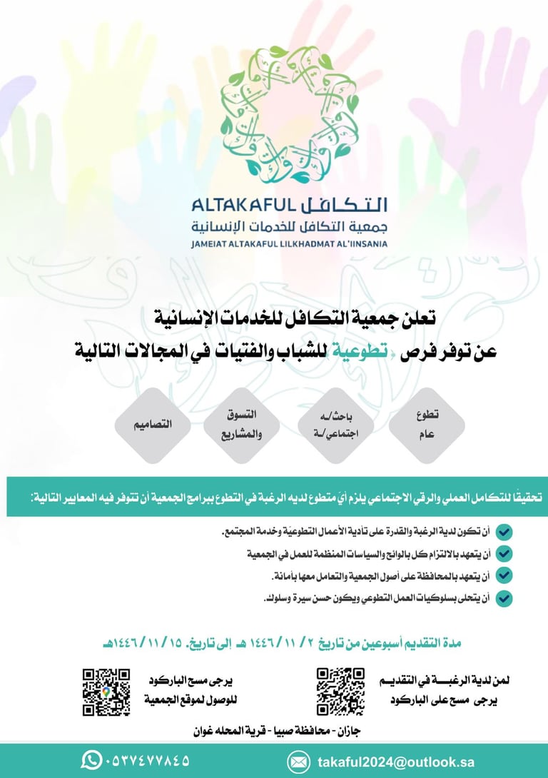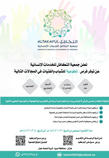 جمعية التكافل للخدمات الإنسانية تدعو الشباب والفتيات إلى التطوّع.